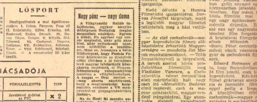 Nagy pénz nagy duma címmel írtak Puskásról (azaz öcsiről, kisbetűvel) szintén a Népszavában 1957 októberében.