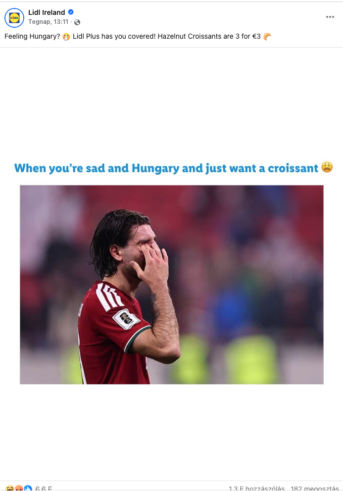 Az ír Lidl sem akart kimaradni a buliból, egy posztjukban a síró Szoboszlaival hirdetik, hogy a mogyorós croissant épp jó árban van, és ha éhes vagy (Hungary – Magyarország, hungry – éhes) és szomorú, akkor ez mennyire jó ajánlat. Nem ez a legeredetibb szópoén, amit láttunk, de értjük az ír humort, mikor húzzák elő ezt a szóviccet, ha nem most?