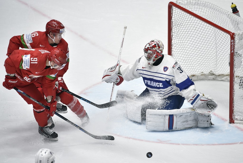 A fehéroroszok érezhetően gyorsabban korcsolyáztak a meccs első felében, ráadásul a franciák rengeteg kiállítást is kaptak, ennek ellenére derekasan állták a sarat a hatalmas fehérorosz nyomással szemben. Egészen a 25. percig, amikor Andrei Stasnak egy balszerencsésen kipattanó korongot sikerült bekotornia a franciák kapujába, így 1-0-ra vezettek a fehéroroszok. Külön bosszantó, hogy a támadás valószínűleg lesről indult, de ezt a játékvezetők nem vették észre.