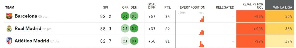 A statisztikai adatelemzéssel foglalkozó FiveThirtyEight némiképp meglepetésre 50 százalék esélyt ad a Barcelona bajnoki címére, a Real Madridnak 33 százalékot, az Atléticónak mindössze 17 százalékot. Az oldal a csapatok formáját, a keret erősségét és a menetrendet is figyelembe veszi, de az elmúlt években többször bebizonyosodott, hogy közel sem tévedhetetlen, elég csak a tavalyi Bajnokok Ligájára vagy az NBA-rájátszásra gondolni.