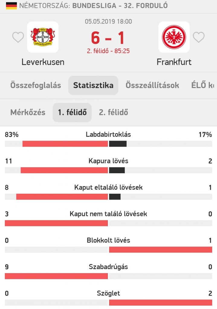 Az első félidőben, azon kívül, hogy hat gólt kapott, mindössze 17%-ban birtokolta a labdát az Eintracht – nincs hivatalos adatunk, de ez csúcsközeli mélypont lehet.