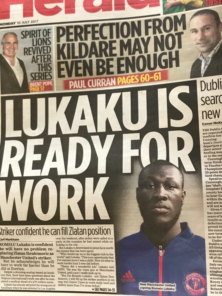 A The Herald borzasztóan naprakész és bréking akart lenni, annyira, hogy hamarabb találtak MU-cuccos képet Lukakuról, minthogy bemutatták volna a csatárt.