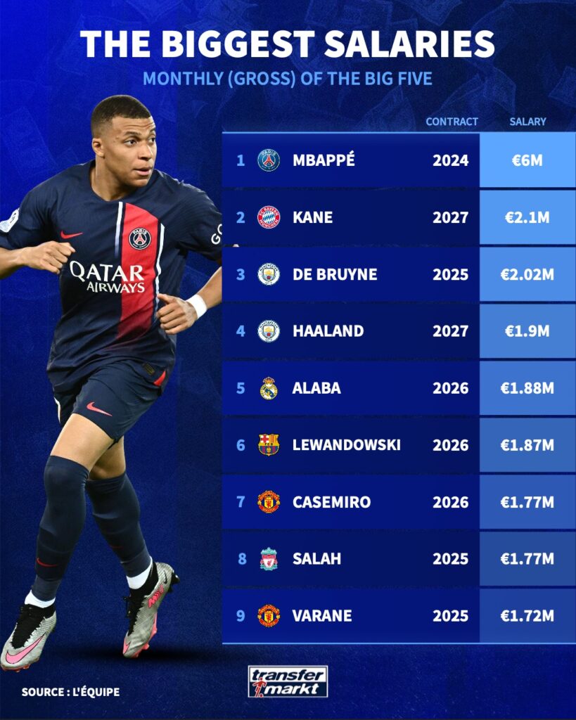 Havi bontásban Kylian Mbappé hatmillió eurót keres, ez majdnem háromszor több, mint a listán második helyen álló Harry Kane, aki 2,1 millió eurót kap a Bayern Münchentől minden hónapban.