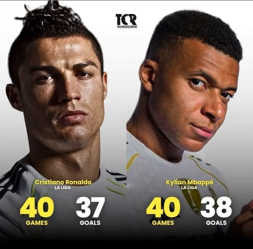 Mbappé az első 40 spanyol bajnokiján 38 alkalommal talált be, ezzel pedig megelőzte Cristiano Ronaldót, aki az első 40 La Liga-meccsén 37 gólig jutott.