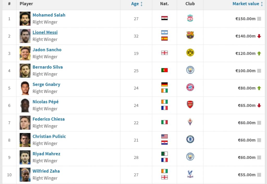 A játékosok piaci értékével foglalkozó szakoldal szerint a világ legértékesebb jobbszélsője nem Lionel Messi, hanem Mohamed Szalah. Az oldal a Pool játékosát 150 millió euróra értékeli, míg Messit már csak 140 millióra. A harmadik helyen a Dortmund fiatal szenzációja, Jadon Sancho található, Bernardo Silva a negyedik, Serge Gnabry az ötödik.
