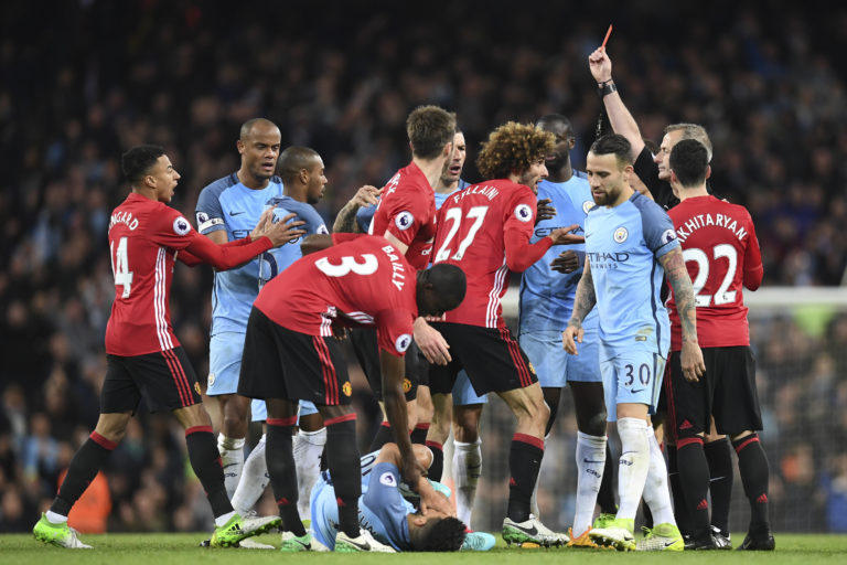A manchesteri derbit a City uralta, végül 0–0 lett, a legemlékezetesebb jelenet Fellainié volt. A belga egészen hülye módon állíttatta ki magát: