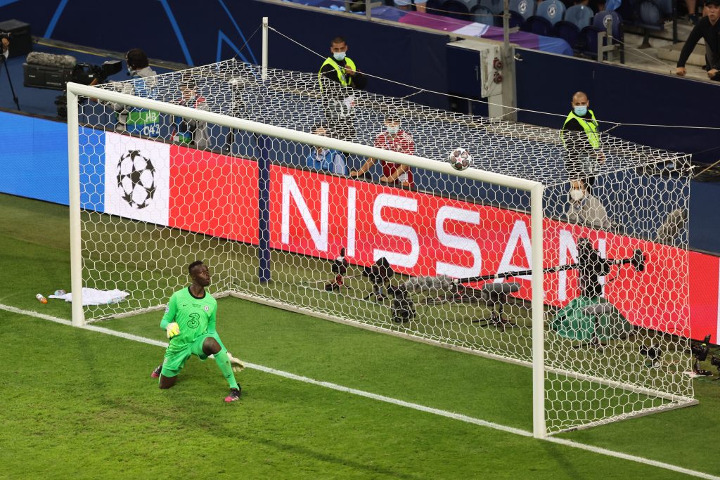 A Chelsea kapusa, Édouard Mendy lefagyva figyelni, ahogy Rijad Mahrez lövése nem sokkal elkerüli a kapuját az utolsó percekben