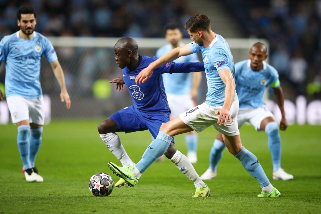 N'Golo Kantét választották a döntő legjobb játékosának; a fotón épp a City futballistáinak gyűrűjében