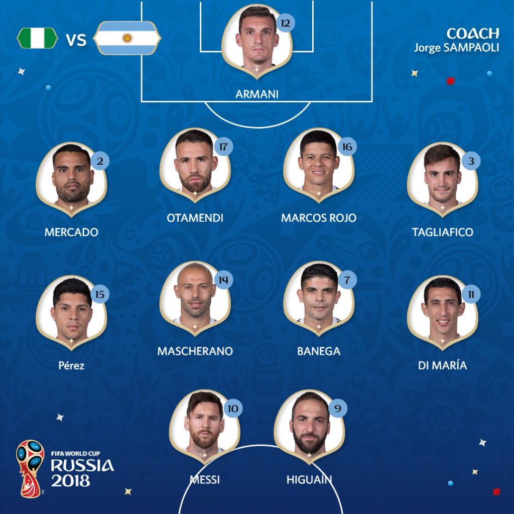 Hogy Sampaoli állította-e össze az argentin kezdőcsapatot, azt talán sose tudjuk meg, de az tény, hogy a már tegnap megszellőztetett csapat állt szemben Nigériával. Ami így 4-4-2, persze Messi szabadon, Di María kicsit előrébb – és ez hasonlított a leginkább a négy évvel ezelőtti döntős csapatra.