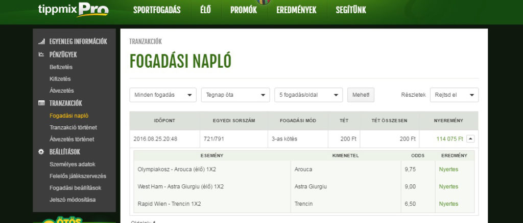 Jól látod, 200 forintos téttel 114 075 HUF érkezett a számlájára, úgyhogy már be is hívtuk, hogy hozzon egy rekesz sört. Ha te is nyernél egy ilyet, mert miért ne, akkor itt tudsz.