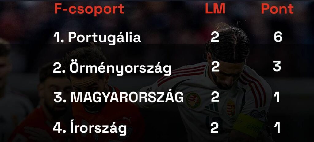 Két forduló után a csoportot hat ponttal Portugália vezeti, az örmények meglepetésre legyőzték az íreket, hárompontosak, a magyar és ír válogatott egy-egy ponttal áll jelenleg. A csoport első helyezettje egyenes ágon kijut a 2026-os Egyesült Államok, Kanada és Mexikó közös rendezésű világbajnokságra, míg a második pótselejtezőn vívhatja ki a vb-indulást.