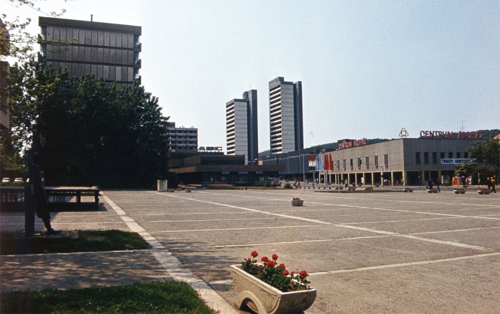 Salgótarján, Fő tér. A jobb oldalon látható Centrum Áruházból való Pintér Attila első labdája