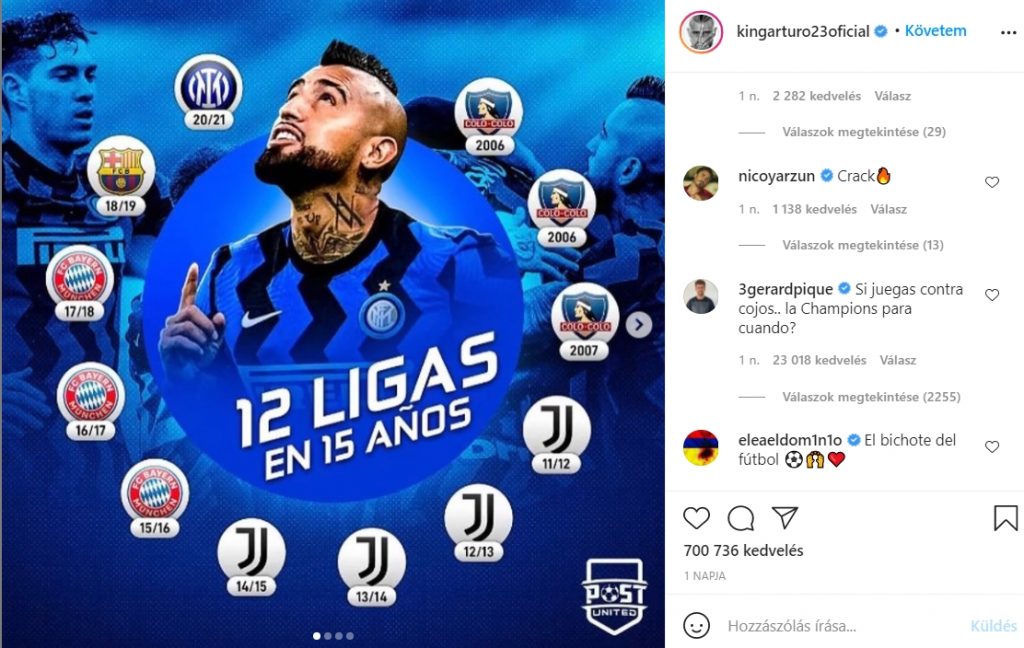 Az Inter hosszabb idő után megnyerte az olasz bajnokságot, a milánóiak középpályása, Arturo Vidal Instagramon egy poszttal ünnepelt. Egyrészt kiemelte a mostani bajnoki címét, másrészt azt a tényt, hogy az elmúlt 15 szezonban a különböző csapataival 12 bajnoki címet nyert.