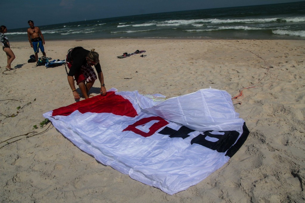 Amint megérkezel, és Vikiék levisznek a partra, a következő fog történni: rögtön jöhet egy teszt kört, némi áhítattal csomagolva ki a legújabb kite-ernyőt!