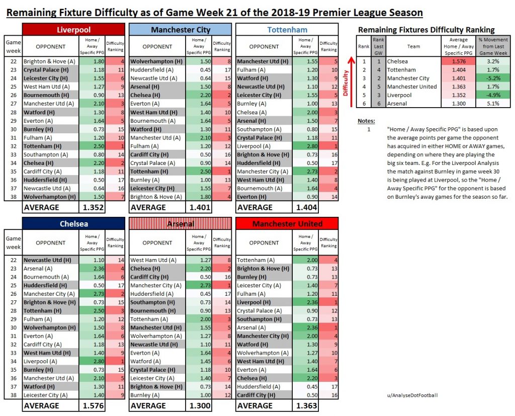 A Liverpool, a Manchester City, a Tottenham, a Chelsea, az Arsenal és a Manchester United hátralévő meccsei, és az erősségi index alapján a Poolnak kellene nyernie a bajnokságot. Nála ugyanis csak az Arsenalnak könnyebb a sorsolása, azonban az ágyúsok 13 ponttal kevesebbet gyűjtöttek, mint Szalahék, így nincs sok esélyük.