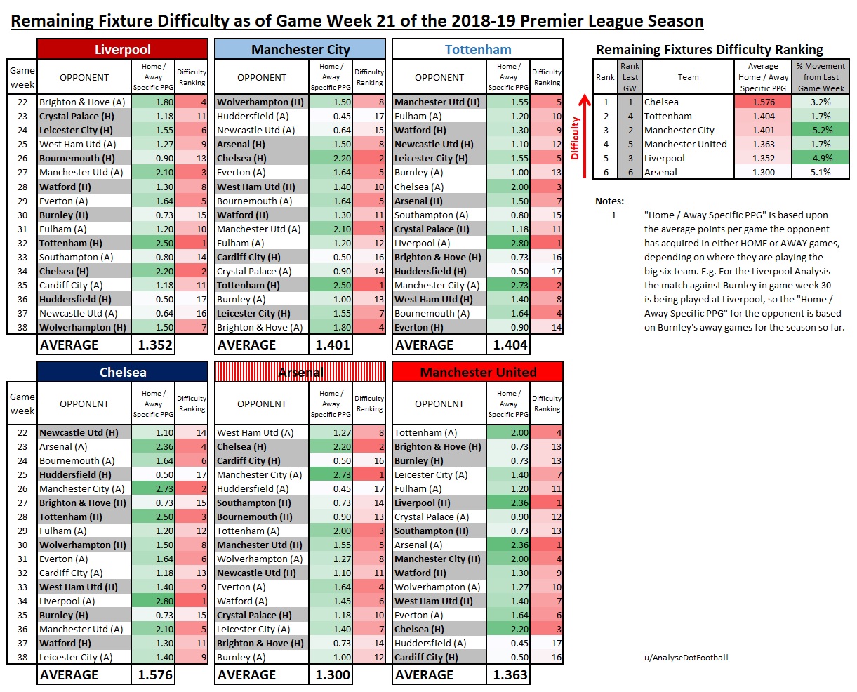 A Poolnak az MU elleni idegenbeli (most már, hogy OGS az edző) és a Tottenham, valamint a Chelsea elleni hazai meccse a legkeményebb, miközben a City például a United elleni idegenbeli meccsen kívül még fogadja az Arsenalt, a Chelsea-t és a Tottenhamet is. Egyébiránt magasan a Chelsea-é a legnehezebb sorsolás.