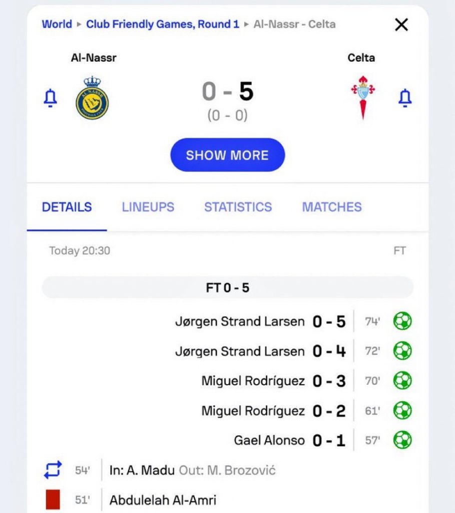 Cristiano Ronaldo és az al-Naszr felkészülési mérkőzést játszott a spanyol bajnokság 13. helyén végzett Celta Vigo ellen. A szaúdi csapatban pályára lépett az Interből igazolt Marcelo Brozovic is.
