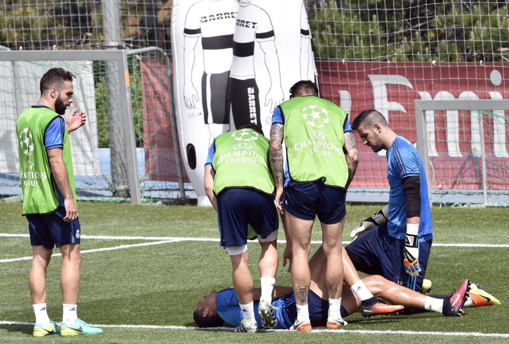 Cristiano Ronaldo a keddi edzésen ütközött Daniel Carvajallal és Kiko Casillával, aztán elterült a földön, majd az orvosi stáb is megjelent, végül (saját lábán) elhagyta a pályát.