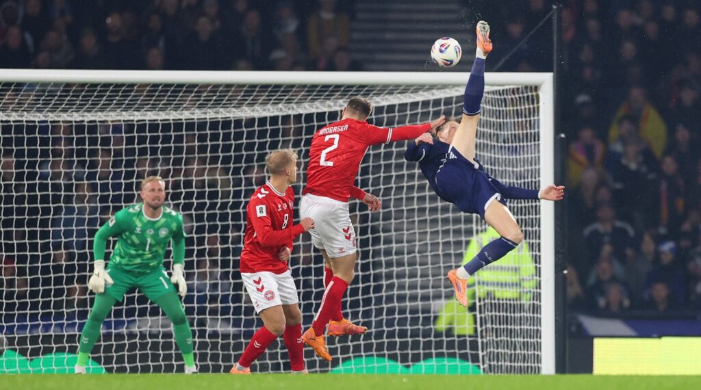 A második félidőben Hojlund egyenlített, a 71. percben Shankland góljával viszont már újra a skótok vezettek, 81. percben Dorgu találatával újra iksz volt a meccs, a döntetlen a dánoknak vb-szereplést ért. A 93. percben Kieran Tierney 20 méterről a dán kapuba csavart, újra Skócia állt továbbjutásra.