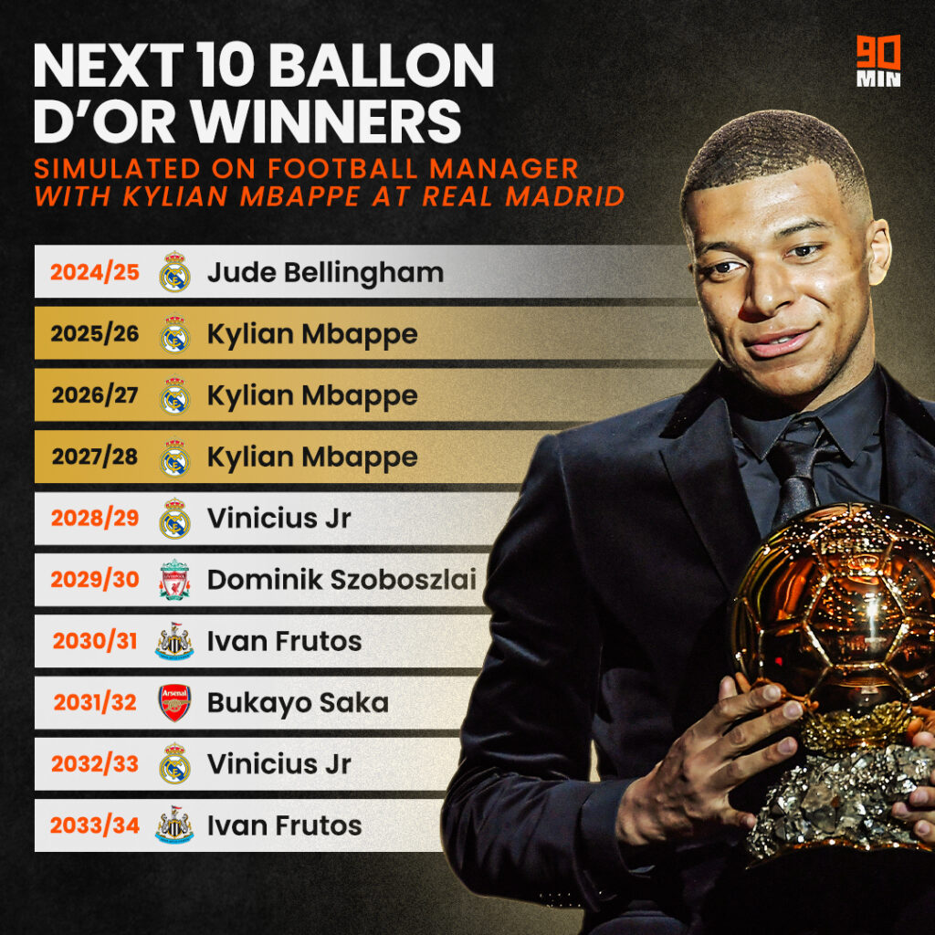 A legnépszerűbb futballszimulátorban, a Football Managerben végeztek el egy szimulációt annak apropóján, hogy hogyan fog alakulni az elkövetkező tíz év aranylabdásainak listája azután, hogy Kylian Mbappé minden bizonnyal a Real Madridhoz igazol: