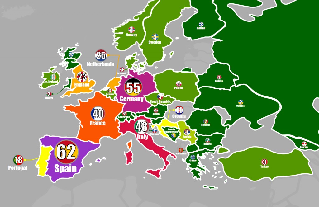Szóval ezen a színes térképen azt láthatod, hogy az európai országok hány játékosa játszott Bajnokok Ligája-döntőt a sorozat 1993-as indulása óta.