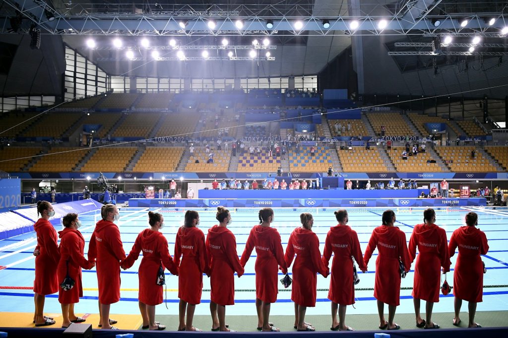 A magyar női vízilabda-válogatott tagjai kézen fogva várják az Orosz Olimpiai Csapat elleni csoportmeccset