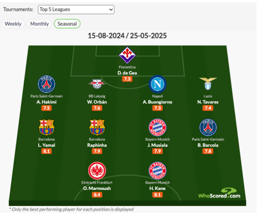 A 32 éves Orbán olyan játékosokkal van a szezon eddigi csapatában, mint Kane, Musiala, Yamal vagy Raphinha.