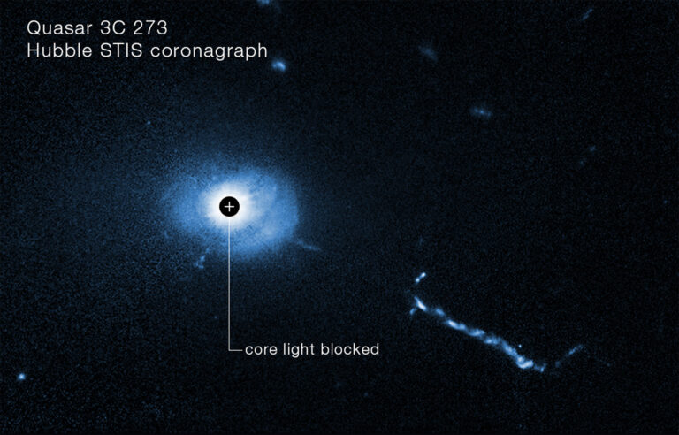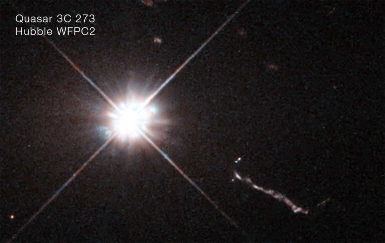 A Hubble űrteleszkóp minden eddiginél közelebbről vizsgált meg egy kvazárt, a 3C 273 jelű objektumot, amely 2,5 milliárd fényévre található a Földtől. A megfigyelések során különös dolgokra bukkantak a környezetében a kutatók: különböző méretű „gömböcskéket” és egy rejtélyes, L alakú szerkezetet azonosítottak, amelyek mintegy 16 ezer fényévnyire helyezkednek el a központi, szörnyetegként tomboló fekete lyuktól.