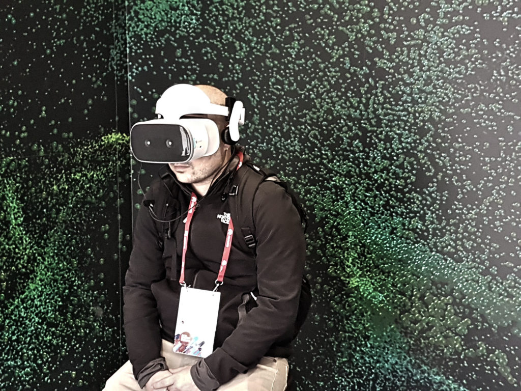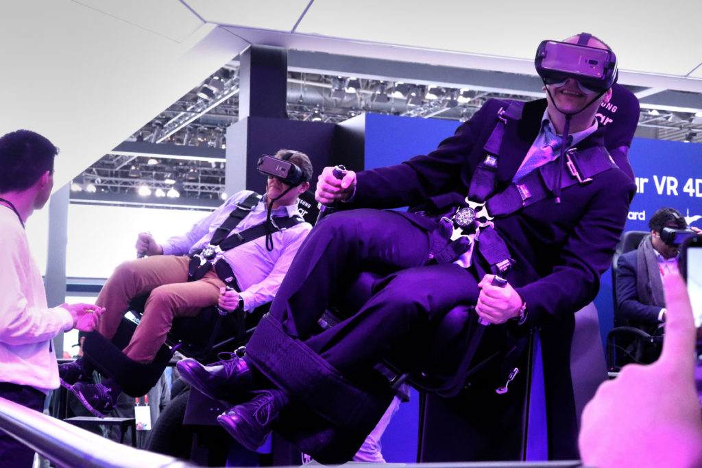 Az iPhone-koppintások mellett a másik dolog, amiből nagyon sok volt Barcelonában, az a virtuális valóság. Ebben főleg a HTC és a Samsung vitte a pálmát: előbbi egy komplett hőlégballont is felépített egy hőlégballon-szimulátorhoz, utóbbi pedig egy kisebb vidámparkot hozott magával az MWC-re. Mi egy elég furcsa hullámvasút-síszimulátor hibridbe raktuk be magunkat, ami a fejjel lefelé borogatós székekhez képest kívülről veszélytelennek tűnt, de nem. Nem volt az. Az illúzió szerencsére nem tökéletes, mert akkor a rohammentők vittek volna el a kiállításról, de azért több, mint meggyőző.