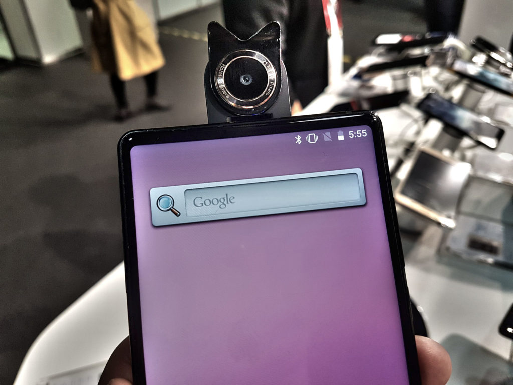 A keret nélküli kijelző vs előlapi kamera háborút a legtöbb gyártó úgy tudta le, hogy gátlástalanul lemásolták az Essential Phone (avagy az iPhone X) dizájnját, de azért voltak érdekesebb megoldások is, például az MWC leghátsó zugában, a "kínai negyed" mélyén megbújó Bluboo-é. Ők egy kifordítható kamerát raktak a telefonra, vagyis az előlapi kamera itt egyben a hátlapi kamera is. Az első teszttelefonról sikerült lendületesen letépnünk a nyitófület, amiért kicsit szégyelltük is magunkat (összesen két prototípus volt kiállítva), bár szakmai szemmel nézve az, hogy véletlenül le tudod tépni a fület, nem sok jót mond el egy telefonról.