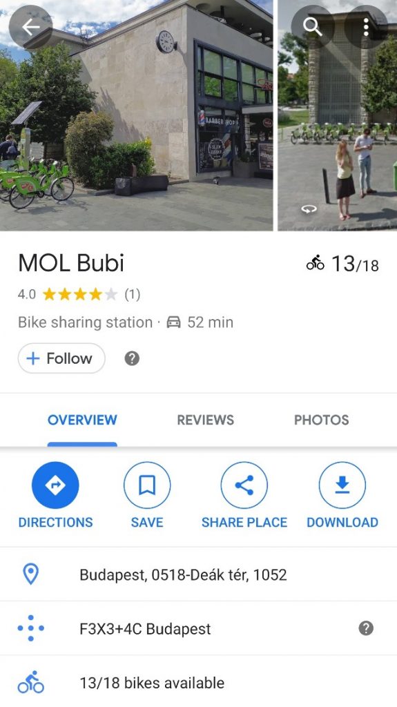 A Google Térkép ugyanis mostantól nem csak azt mutatja meg, hol vannak kerékpárgyűjtő állomások Budapesten, de valós időben mutatja azt is, hogy éppen hány bicikli érhető el az adott állomáson. A cikk írásának pillanatában például az erzsébet téri MOL Bubi állomáson 13 bringa állt bent a 18-ból.