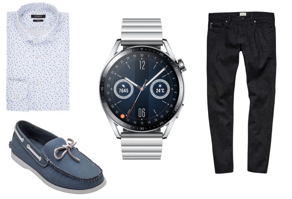 Az elegáns viselethez mindenképp váltsunk szíjat, ebben az esetben jó választás lehet egy bőrszíj is, de a Huawei saját gyártású fémszíja is rendkívül modern és elegáns kinézetet kölcsönöz a szettünknek. Egy a kék árnyalatú cipőhöz és az ing mintájához kiválóan illő kék számlapot választottam az outfithez, de ha szeretnénk feltűnősködni, akár arany színekben pompázó számlapok közül is választhatunk.