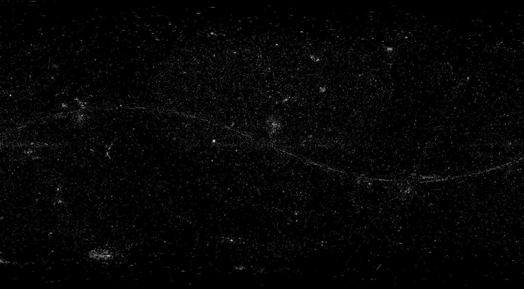 A képen a középső görbe vonal az ekliptikát ábrázolja, ami saját Naprendszerünk bolygóinak, holdjainak és aszteroidáinak számos (és ismételt) megfigyelésén alapul. A bal alsó sarokban található két nagy csomó a nagy és a kis Magellán-felhő. A többi csomó más közeli galaxis.