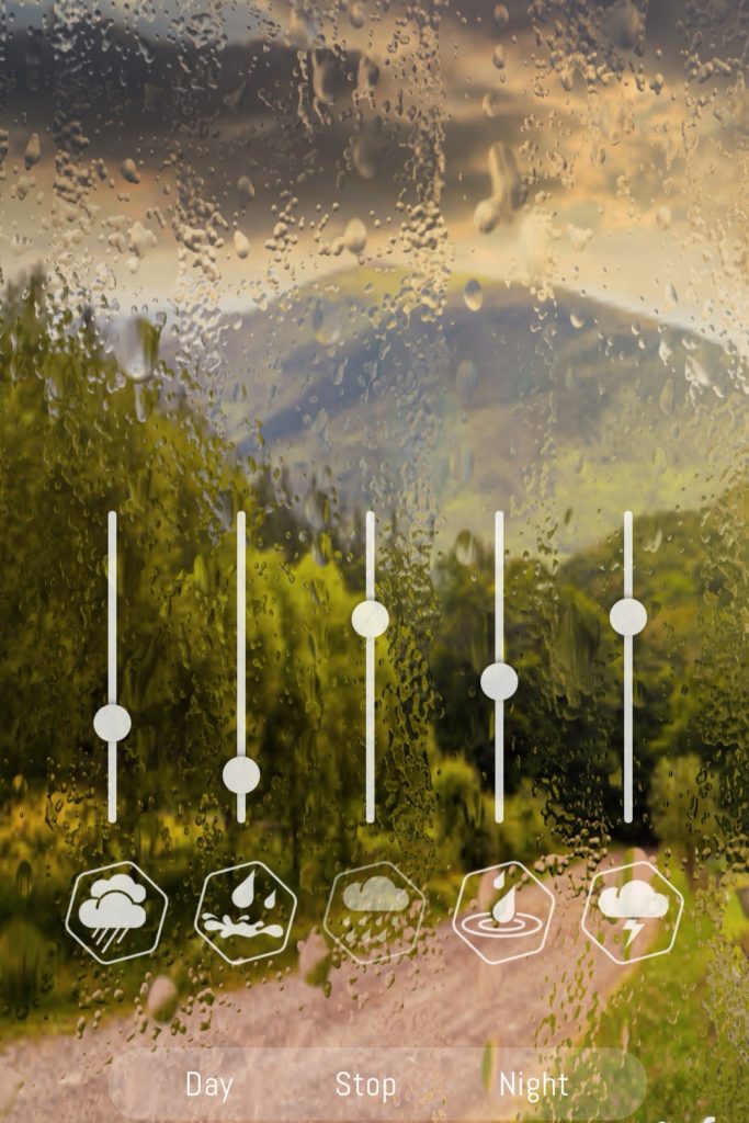 A programmal igazi esőistent játszva öt különböző esőhangból mixelhetjük össze a tökéletes esőt, sőt, azt is megadhatjuk, hogy nappal legyen vagy éjszaka. Minél durvább esőt keversz, annál több lesz az esőcsepp is a telefonod kijelzőjén, de persze az igazi ínyencek nem a mennyiségre mennek, hanem hogy egy leheletnyi mennydörgésből, egy ujjnyi ablakon kopogó esőből és némi záporból megalkossák a tökéletes esőt.