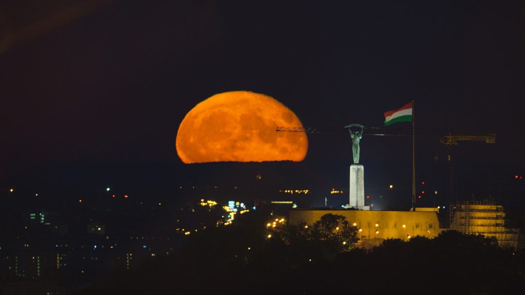 Beinrohr László pedig meg is örökítette a nagyobb és fényesebb kelő teliholdat, ami fotóin világító/izzó óriásgömbként a kúszott fel az égboltra a Gellért-hegynél:
