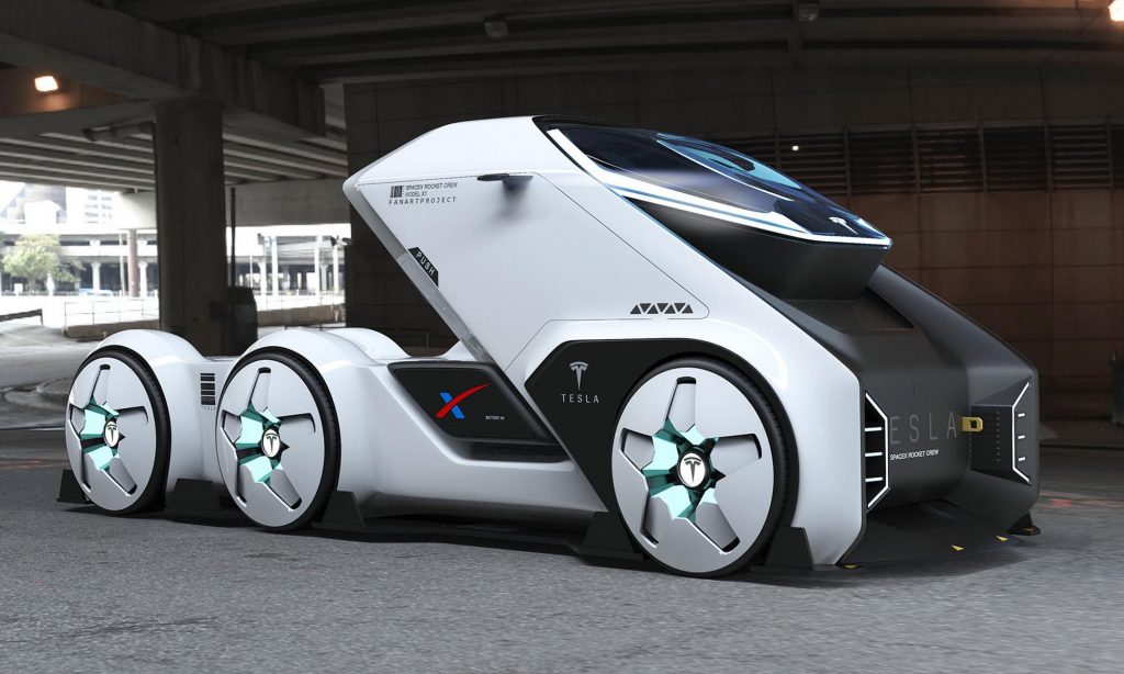 A hatkerekű jármű a Tesla SpaceTruck Concept nevet kapta, természetesen tisztán elektromos hajtású, és a dizájnjával a Star Wars univerzumában is megállná a helyét. A vontatóhoz egy hasonlóan futurisztikus pótkocsit lehet kapcsolni.