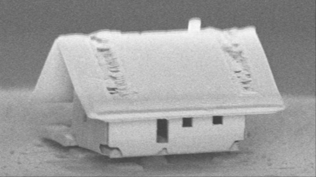 A házikót egy 300 x 300 mikrométer nagyságú lapból vágták ki, mely alig haladja meg egy átlagos homokszem méretének a felét. (Egy milliméter ezer mikrométer.) Az épület hosszúsága mindössze 20 mikrométer, ami annyira apró, hogy egy porszemet sem lehetne beletuszkolni.