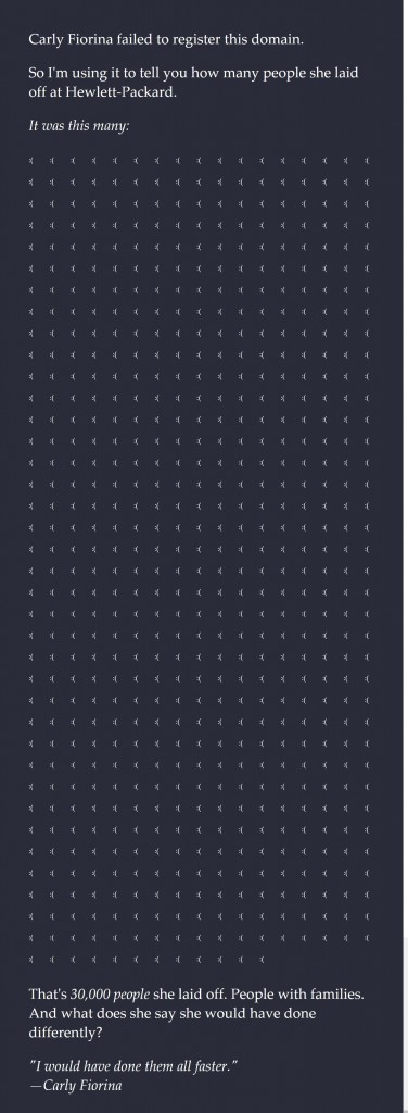 Pechére, a CarlyFiorina.org domaint nem azért csapták le az orra elől, hogy később jelentős felárral továbbpasszolják neki, a domain birtokosa ugyanis azóta a következő képet helyezte el az oldalon (aminek mi most csak a rövidített változatát közöljük):