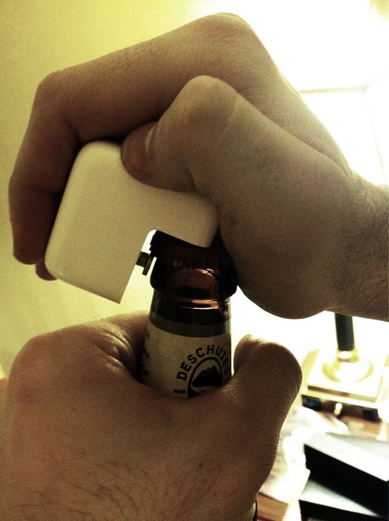 Briliáns felhasználása egy rendeltetését tekintve teljesen más szolgálatra szánt eszköznek. Nyiss ki bármilyen sört, üdítőt az Apple töltőjével! Eva Giselle grafikus a jelek szerint iPadet (is) használ és bekövetkezett életében az a pillanat, amikor kellett egy sörnyitó. Igen. Mindannyian éltünk már át ilyen drámai helyzetet és jól tudjuk, hogy öngyújtóval, ajtózárral, csavarhúzóval is ki lehet nyitni egy sört, de vajon stílusosan hogyan? Hát így! Bravó Eva, és köszönjük!