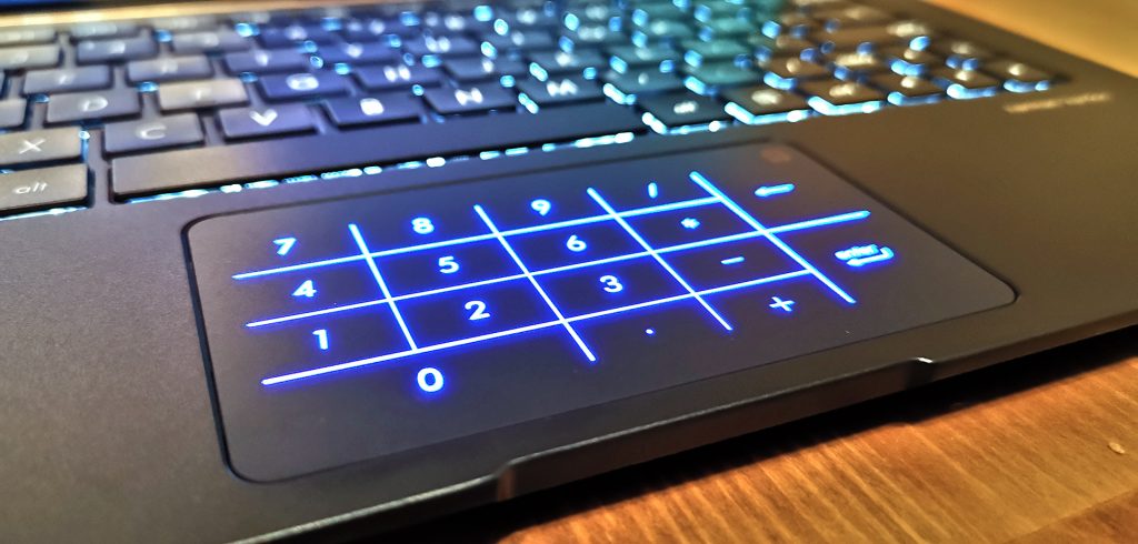 Ahogy említettük, apróbb különbségek azért vannak a két notebook között, ezek közül a kedvencünk az, ahogyan a 13 colos laptopnál megoldották a numerikus billentyűzet hiányát. Egy ilyen kis méretű gépben ugyebár a számbillentyűzet már nem fér el a klaviatúrán, cserébe viszont a touchpad jobb felső sarkában találunk egy gombot, amivel a touchpad egy gombnyomással numerikus billentyűzetté alakítható.