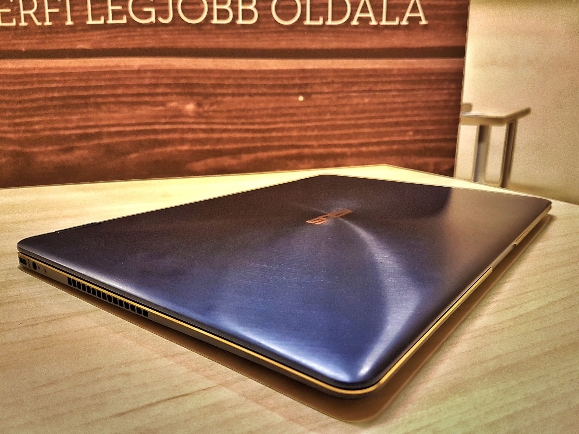 Na jó, nem rögtön rögtön, hiszen előtte még elidőztünk a Zenbookoktól megszokott finom vonalakon, a kék színű, szálcsiszolt fémburkolat tökéletességén, a géphez grátiszba kapott bőr borítéktáska eleganciáján, és közben azon gondolkodtunk, hogy vajon hogyan sikerült két USB-C-csatlakozót is beszuszakolnia az Asusnak egy mindössze 10,9 mm vastag laptopba, aminek köszönhetően a Zenbook Flip S-hez nem feltétlenül szükséges egy otromba adaptert hozzácsapnunk.