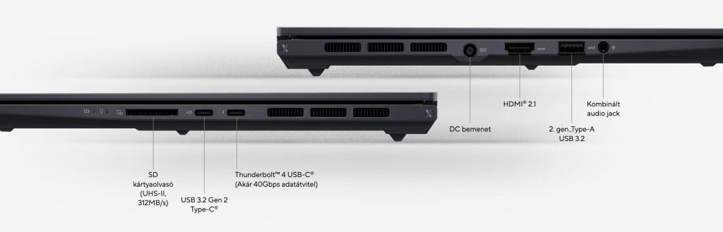 A klasszikus Zenbook-kinézetű (azaz elegáns és rendkívül letisztult), aluminium házába bivaly hardver került a legújabb 13. generációs Intel® Core™ i9-13900H processzor és a stúdiószintű NVIDIA® GeForce RTX™ 4070 videókártya formájában – itt gyorsan megjegyeznénk, hogy utóbbi nem gamingre termett, szóval érdemes kissé elnézőnek lenni vele ebből a szempontból. Mindehhez pedig hozzájön még 16 GB integrált DDR5 RAM (plusz egy maximum 32 GB-os SO-DIMM-et befogadó foglalat) és egy 2 TB-os SSD, és egy 76Wh-s akkumulátor, ami 10 órát ígér (kiegyensúlyozott üzemmódban).Az elnevezéséből sejthető, hogy a gép 14 hüvelyk körüli OLED kijelzővel büszkélkedhet, ami egészen pontosan egy 14,5 colos, 2,8K (2880×1800) felbontású, 120Hz-es OLED NanoEdge Dolby Vision (érintő)képernyőt takar