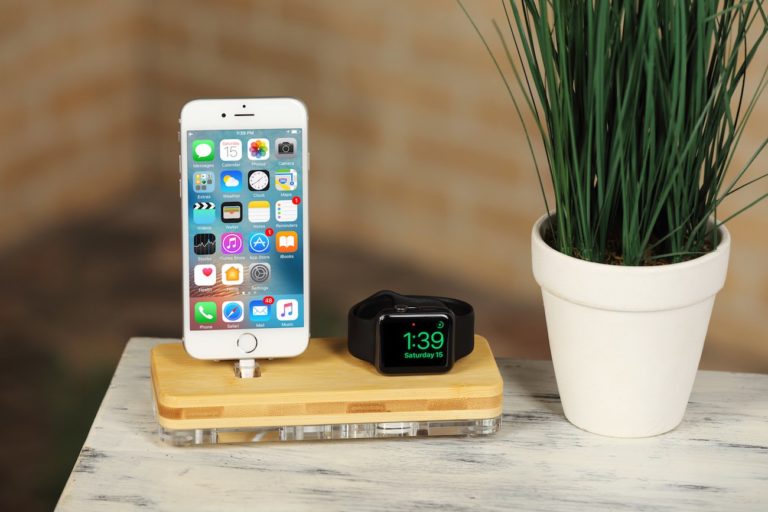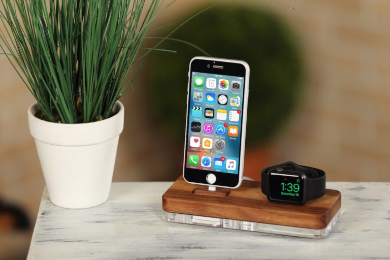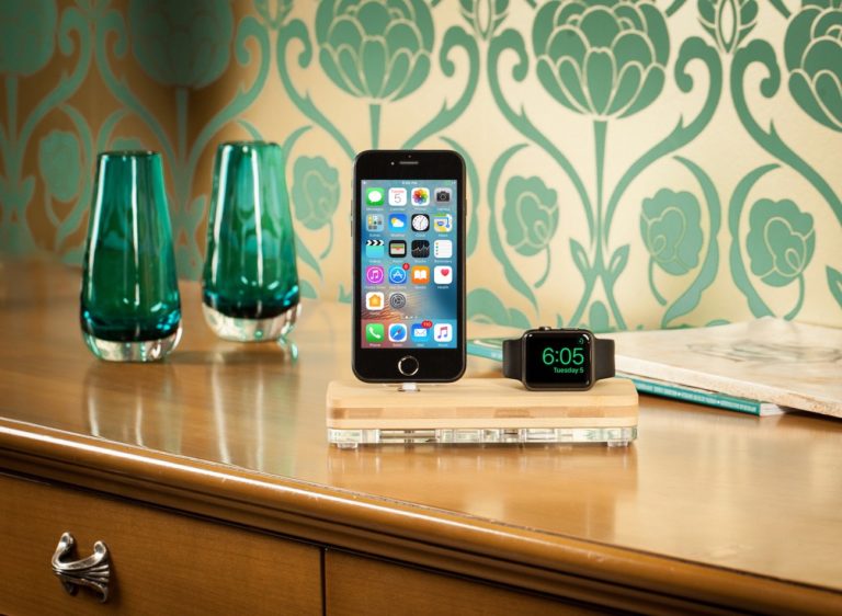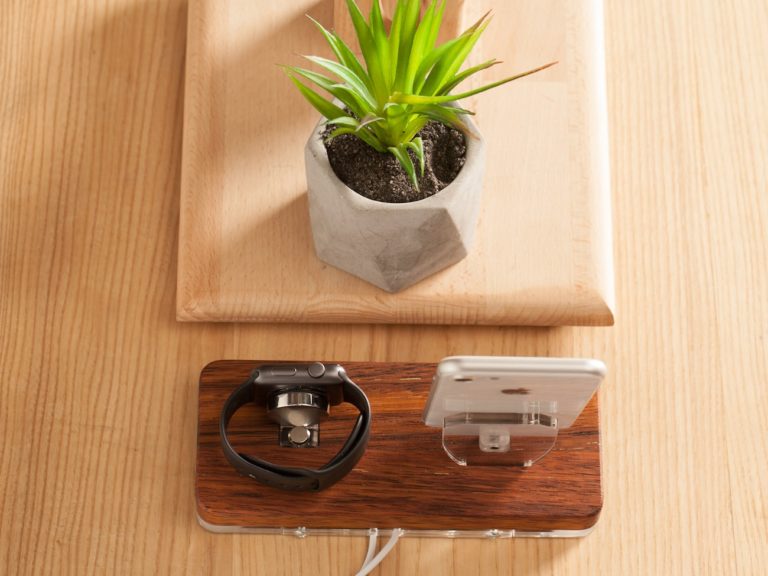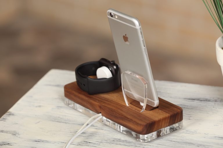A fából készült dokkoló amúgy nem csak szép, de praktikus is, hiszen egyszerre töltheted róla az összes készülékedet, és támogatja a gyorstöltést is.