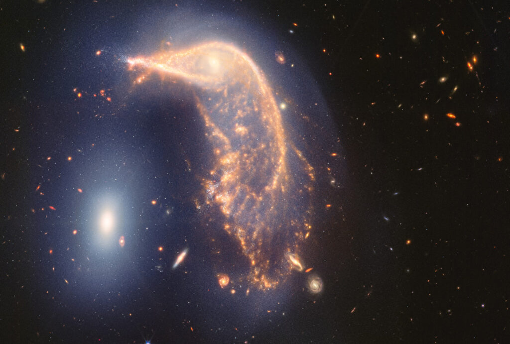 A James Webb megörökítette két összeütköző galaxist a Földtől mintegy 326 millió fényévre, a Hidra csillagképben. Az Arp 142 nevű galaxispáros tagjai, az NGC 2936 és az NGC 2937 több tízmillió évvel ezelőtt kezdtek összefonódni egymással, és már csak 100 ezer fényévnyi távolságra vannak egymástól – ez csillagászati szempontból igen kis távolságnak számít –, a szakértők szerint pedig nagyjából százmillió év múlva egyesülnek, azaz összeolvadnak egyetlen galaxissá.