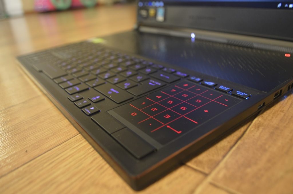 Mert hát ha ránéz az ember, akkor feltűnik, hogy itt valami nincs rendben, a hűtés túlságosan nagy területet foglal el, letolta a billentyűzetet, mire átkerült a tapipad a jobb oldalra. Hát nooormális? De ha az ember belegondol, akkor ennek az egésznek nagyon sok értelme van. Egyrészt egy ekkora méretnél és amúgy minden más méretnél is nagyon fontos a hűtés. Ilyen hardvert pedig valahogy hűvösen kell tartani, ez megmagyarázza a megnövelt hűtőterületet, ami egyébként nem is néz ki rosszul, és nem is először művel ilyesmit az Asus a gamer laptopjaival.