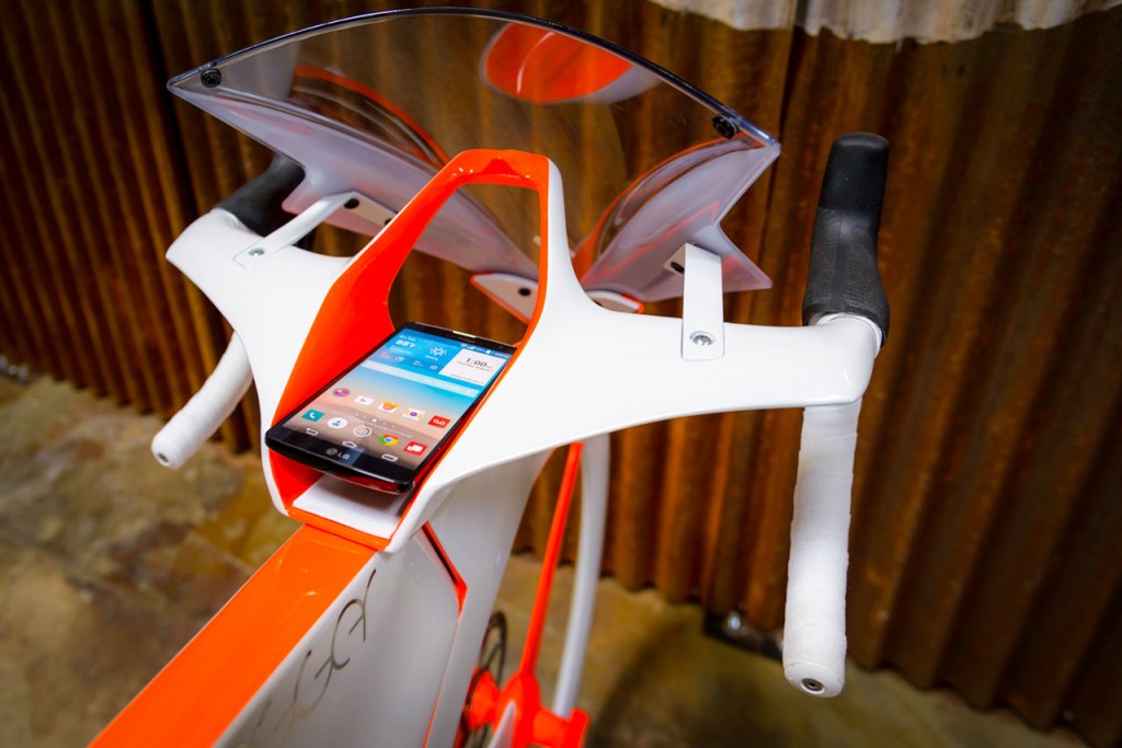 A csodabringa emellett egy kis szélvédőt is kapott, ami ebben az esetben nem annyira a szél vagy az eső elleni védelmet szolgálja, hiszen az egész bicikli úgy lett megtervezve, hogy a lehető legkisebb légellenállást produkálja. A fUCI-n emellett van egy telefon dokkoló is a kormány alatt, ami nem csak arra jó, hogy Kenese mellett ötvennel tépve bejelentkezhetsz a nádas Csárdába Forsquare-en, de például navigációnak is tökéletes megoldás.
