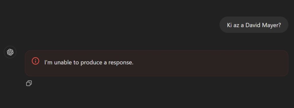 Egy Reddit-felhasználó például a múlt héten arra jött rá, hogy a mesterséges intelligencia egyszerűen megzavarodik a David Mayer név említésére. Természetesen mi is kipróbáltuk a dolgot böngészőben és az alkalmazásban is, és minden esetben vagy hibaüzenet, vagy hibás működés volt a válasz.