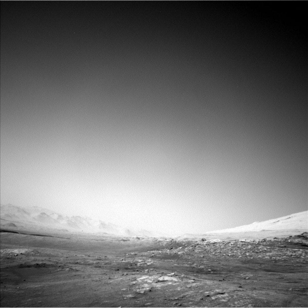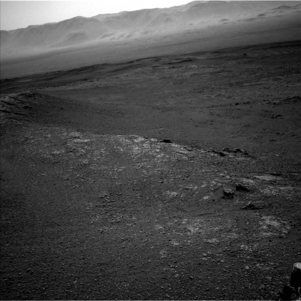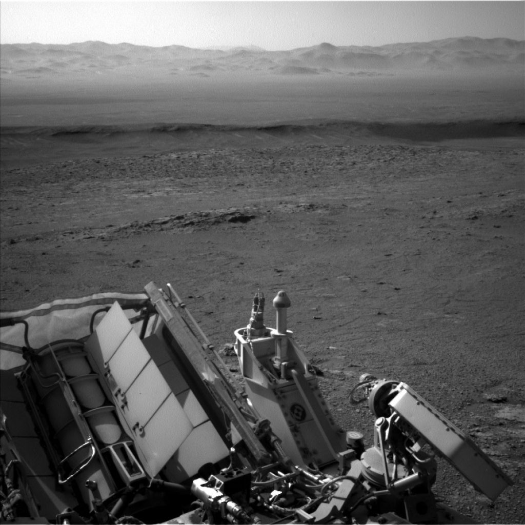 A bal oldali navigációs kamerái által készített monokróm felvételek a Gale-kráter széléről fürkészhető terepet tárják elénk