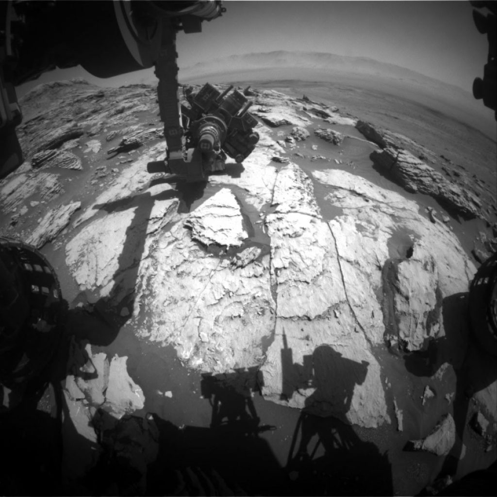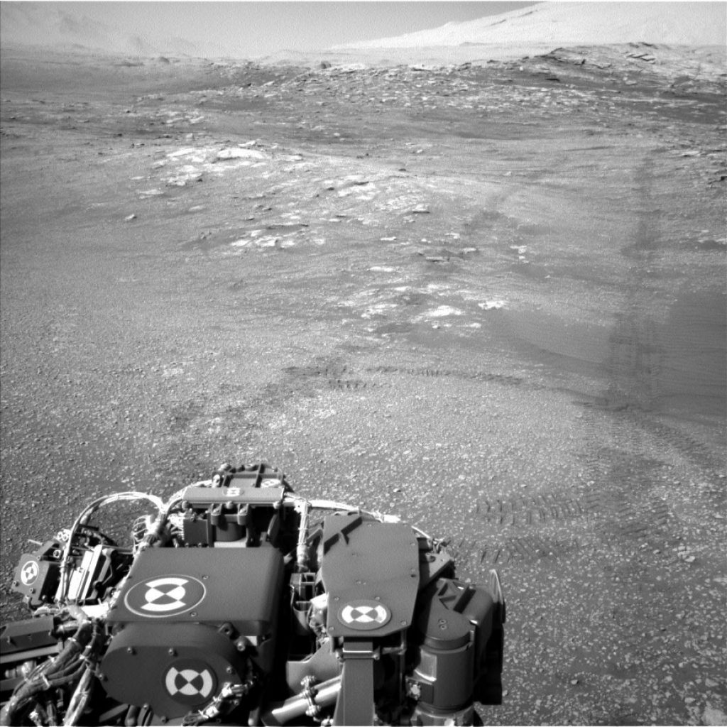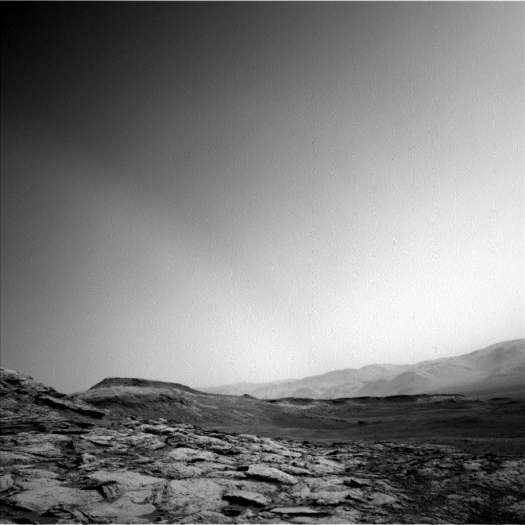 A bal oldali navigációs kamerái által készített monokróm felvételek a Gale-kráter széléről fürkészhető terepet tárják elénk