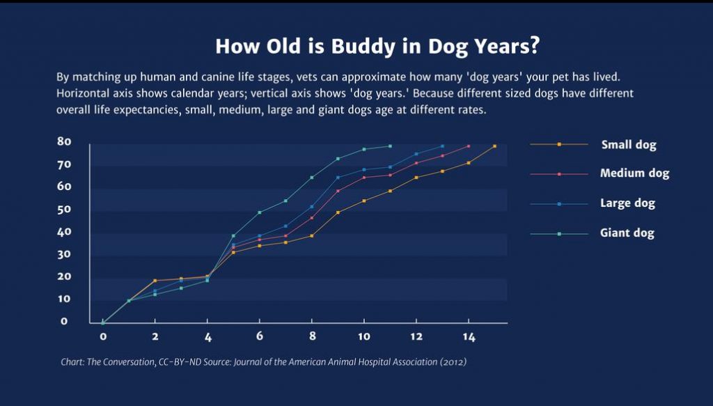 Talán nem árulunk el nagy titkot, hogy általánosságban minél kisebb termetű egy kutya annál lassabban öregszik, vagyis annál hosszabb a várható élettartama. Hogy pontosan mennyi az annyi, ahhoz a legpontosabb meghatározást Jesse Grady állatorvos adta a The Conversationben megjelent cikkében, az általa készített táblázatból bárki könnyedén kiszámolhatja, hogy mennyi idős a kutyája emberévekben (meg persze azt is, hogy ő hány éves lenne, ha kutya lenne). A sárga vonal jelzi a kistermetű kutyák korát, a rózsaszín a közepes termetűekét, a kék vonal a nagy kutyákra vonatkozik, a zöld pedig az óriás termetűekre.